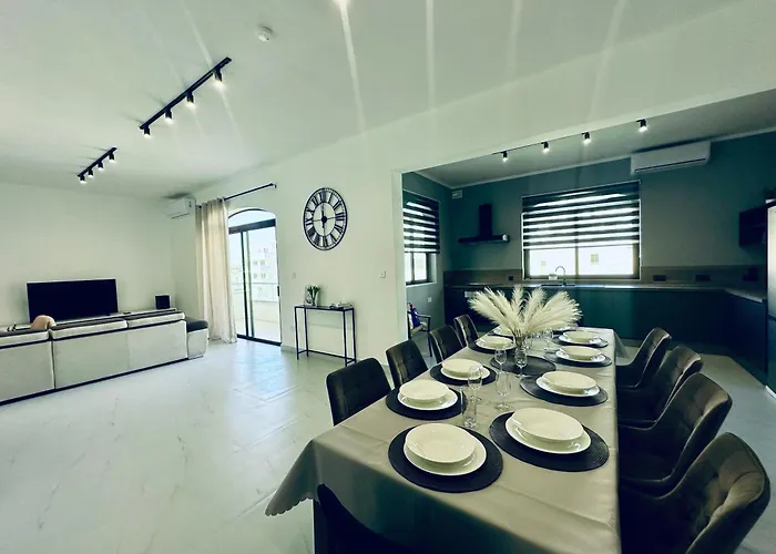The 200 m² New, Modern And Spacious 4Br Apartment In Mellieha is situated 200 metres from Church of Our Lady of Victory and 25 km from Malta International airport. Staying in the apartment, nestled in close proximity to the Mellieħa Air Raid Shelter, guests can relax on a terrace.